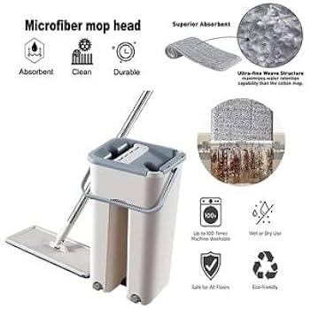 - No Mopping Stains: Unlike traditional mops and spin mops, it leaves no stains. Complete Cleaning System : 2*Machine Washable Microfiber Pads 1-Mop Bucket Mop Extension Handle 1*360° Swivel Head Plate 1*Wash and Dry cover.