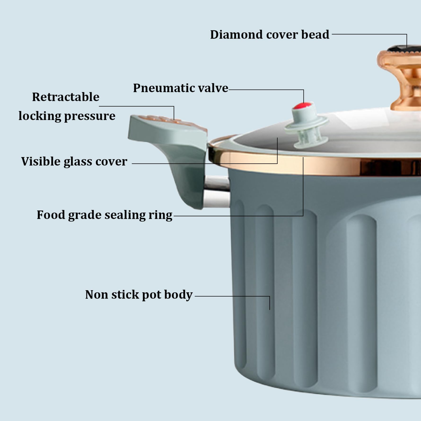 - [Safe to Use]Quick and Efficient Cooking. The pot is designed with a pressure relief valve and a locking lid to prevent accidents. The raised edge of the pot prevents liquid from overflowing. The transparent lid makes cooking status at a glance.