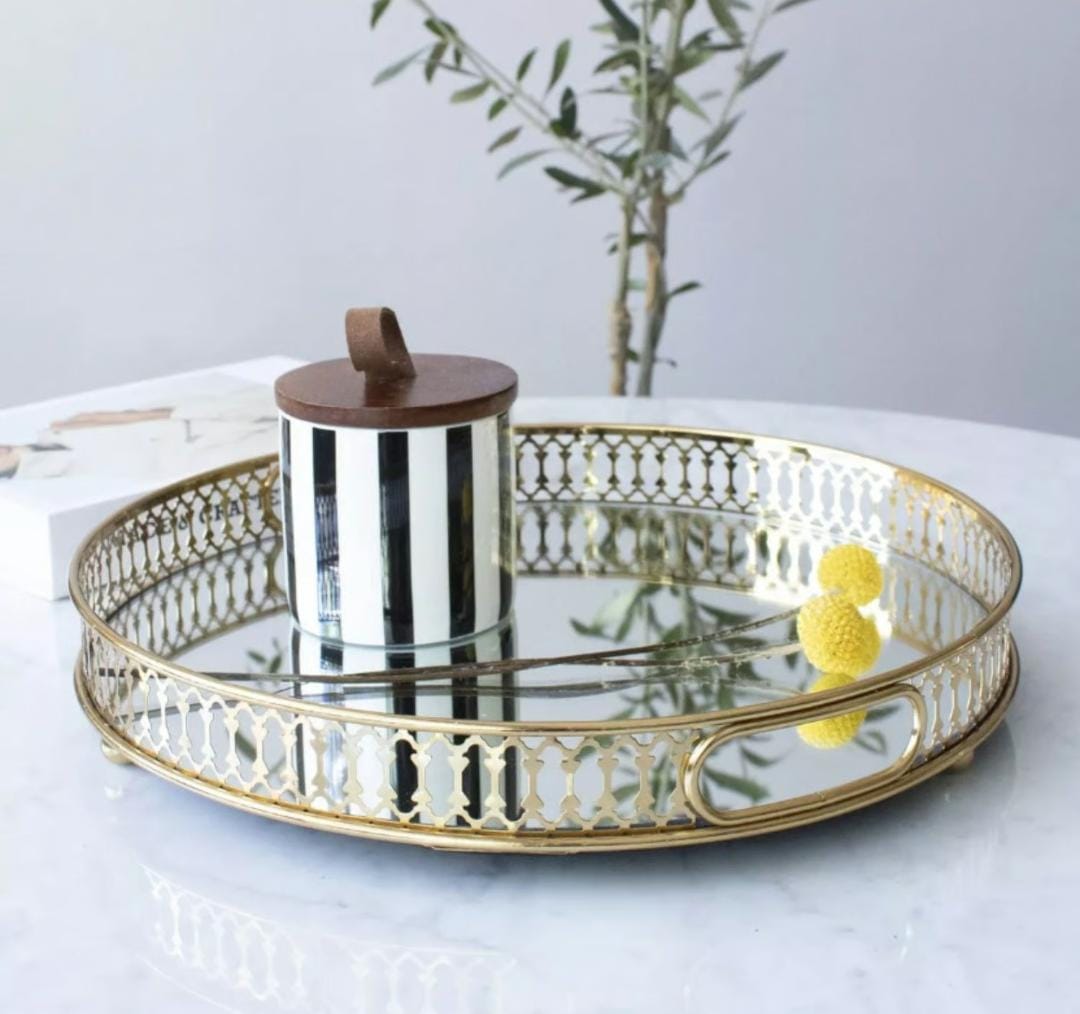 A vanity round decorative gold vintage tray mirror exudes elegance and classic charm. The tray features a reflective mirror surface at the center, surrounded by a beautifully detailed, ornate gold frame. The gold finish often has an antique or brushed look, enhancing its vintage appeal. The frame typically showcases intricate patterns such as floral designs, scrollwork, or filigree, adding a sense of luxury and sophistication. Some trays include small, rounded feet that elevate the mirror slightly above surfaces, while others lay flat. This type of tray is often used for displaying perfumes, jewelry, or cosmetics on a vanity or dresser, combining both functionality and a timeless, decorative accent.